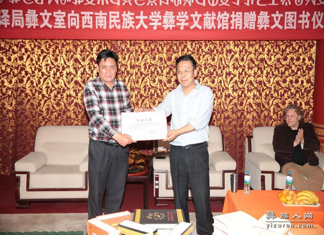 刘勇书记向中央民族语文翻译局彝文室颁发捐赠证书