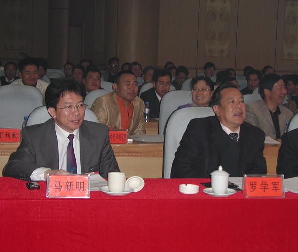 作者参加丽江彝学会成立庆典时与丽江市政协主席罗学军在主席台就座