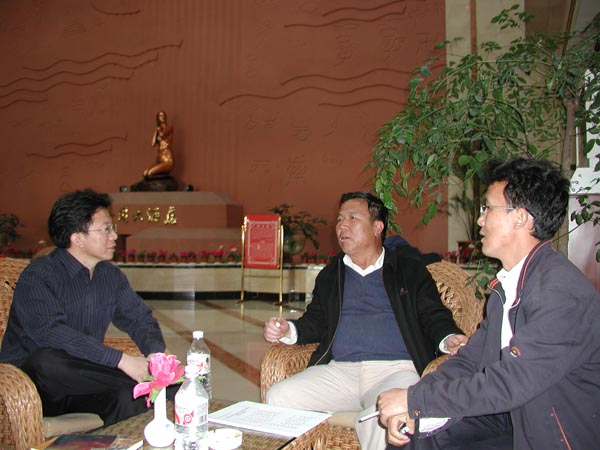 作者(左一)与丽江彝学会会长杨文彬(中)等交流彝学研究心得